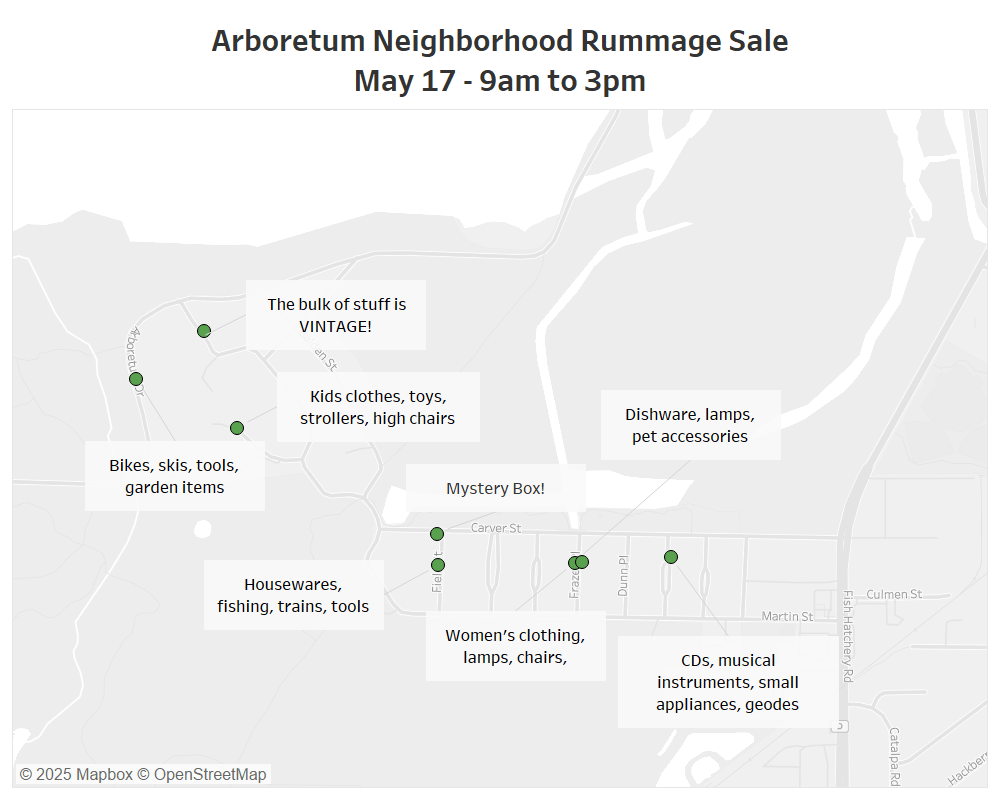 Please join us for the first ever Arboretum Neighborhood Garage Sale. Please review the map below for participating sales. Please note that there are likely more participants than the map represents as some residents were not able to commit before the map detailing deadline. So be on the lookout for signage through the neighborhood to direct you to additional sales! The boundaries of the Arboretum Neighborhood begin along Carver and Martin Streets and the short intersecting roads between. Then the sale area moves up Marshall Parkway and Balden Streets and the areas between. And finally there are a few more participants along Arboretum Drive which ends at the UW Arboretum Visitor Center where they will be holding their annual Native Plant Sale on May 17th as well!